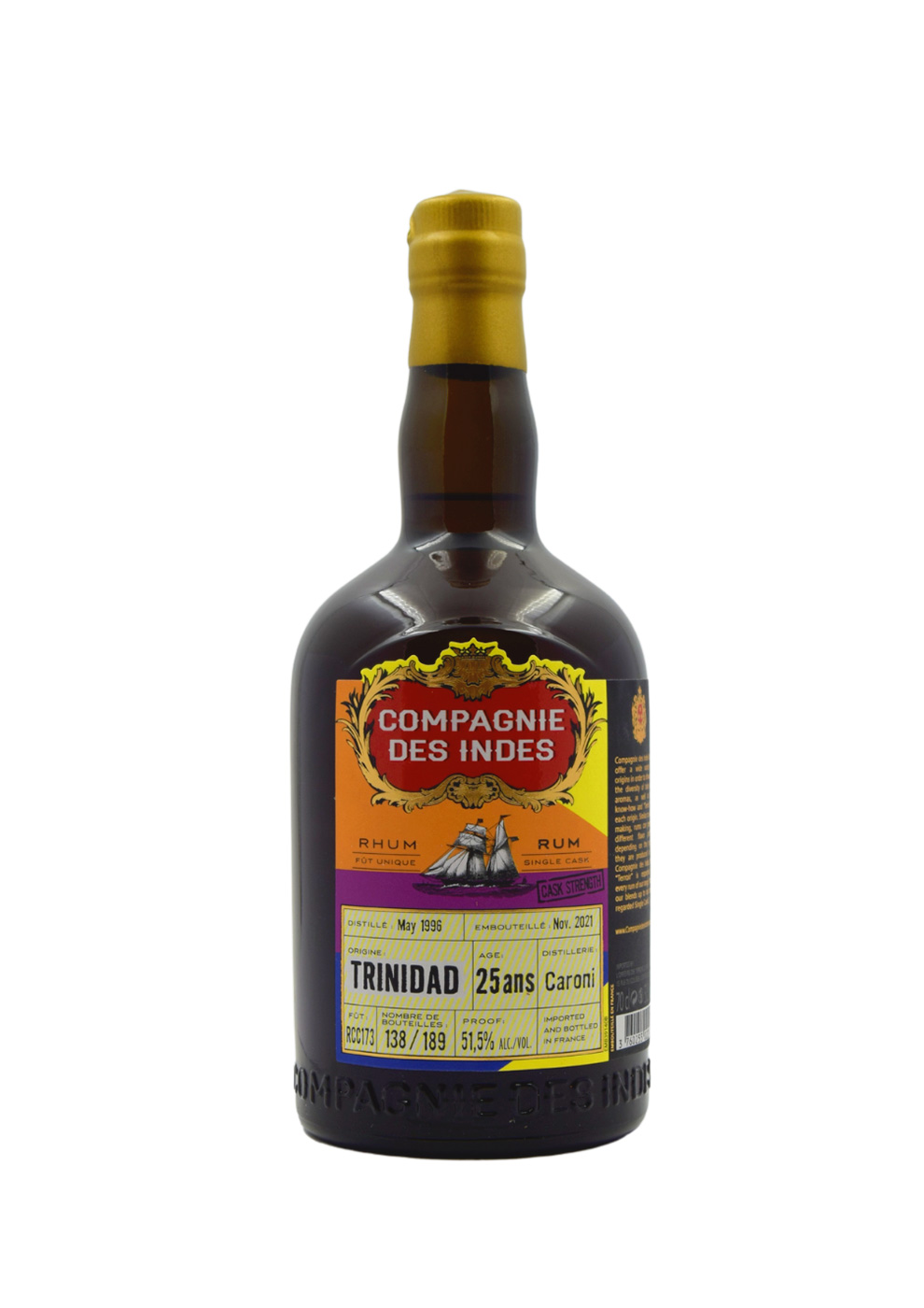 Le rhum Caroni 25 ans Compagnie des Indes est un rhum de mélasse mythique, issu de la légendaire distillerie Caroni à Trinidad, aujourd’hui fermée. Distillé en mai 1996, il a patiemment vieilli sous climat tropical avant d’être embouteillé en 2021 par la Compagnie des Indes, reconnue pour ses sélections exigeantes et son respect du produit.